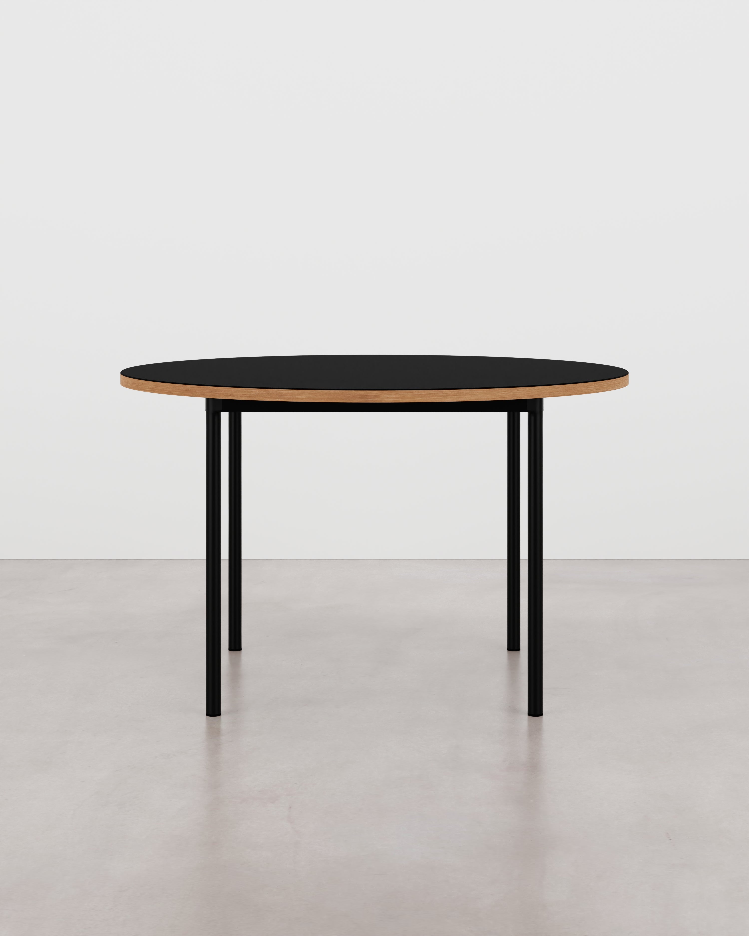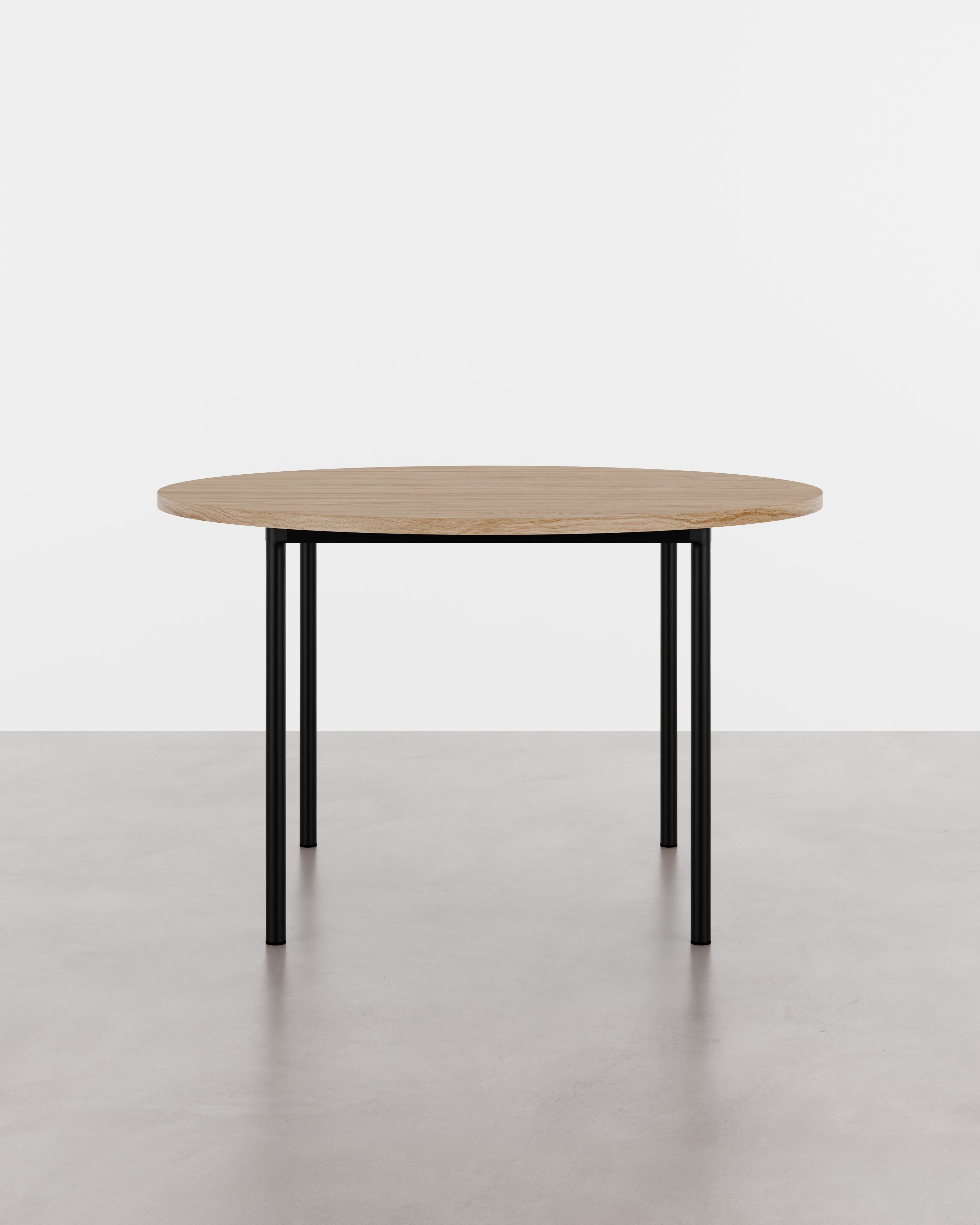 Bordets kanter er udført i massivt, lakeret egetræ, der kombinerer høj slidstyrke med varme og elegance. Stellet og benene er fremstillet i pulverlakeret stål, hvilket giver bordet en robust og stabil konstruktion, der er skabt til at holde til daglig brug i mange år frem.